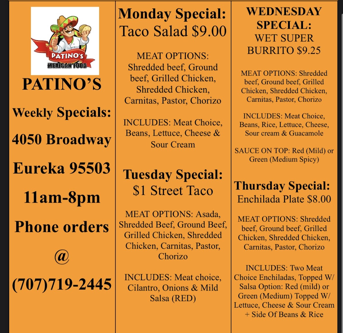 Welcome to Patino's Mexican Food, a vibrant culinary gem located at 4050 Broadway St, Eureka, CA. This bustling eatery is renowned for serving authentic Mexican fare that resonates with both traditional and contemporary flavors. The menu highlights include an array of tacos featuring shredded beef, chicken, and even lengua, crafted with fresh ingredients like onions, cilantro, and radishes that elevate every bite.