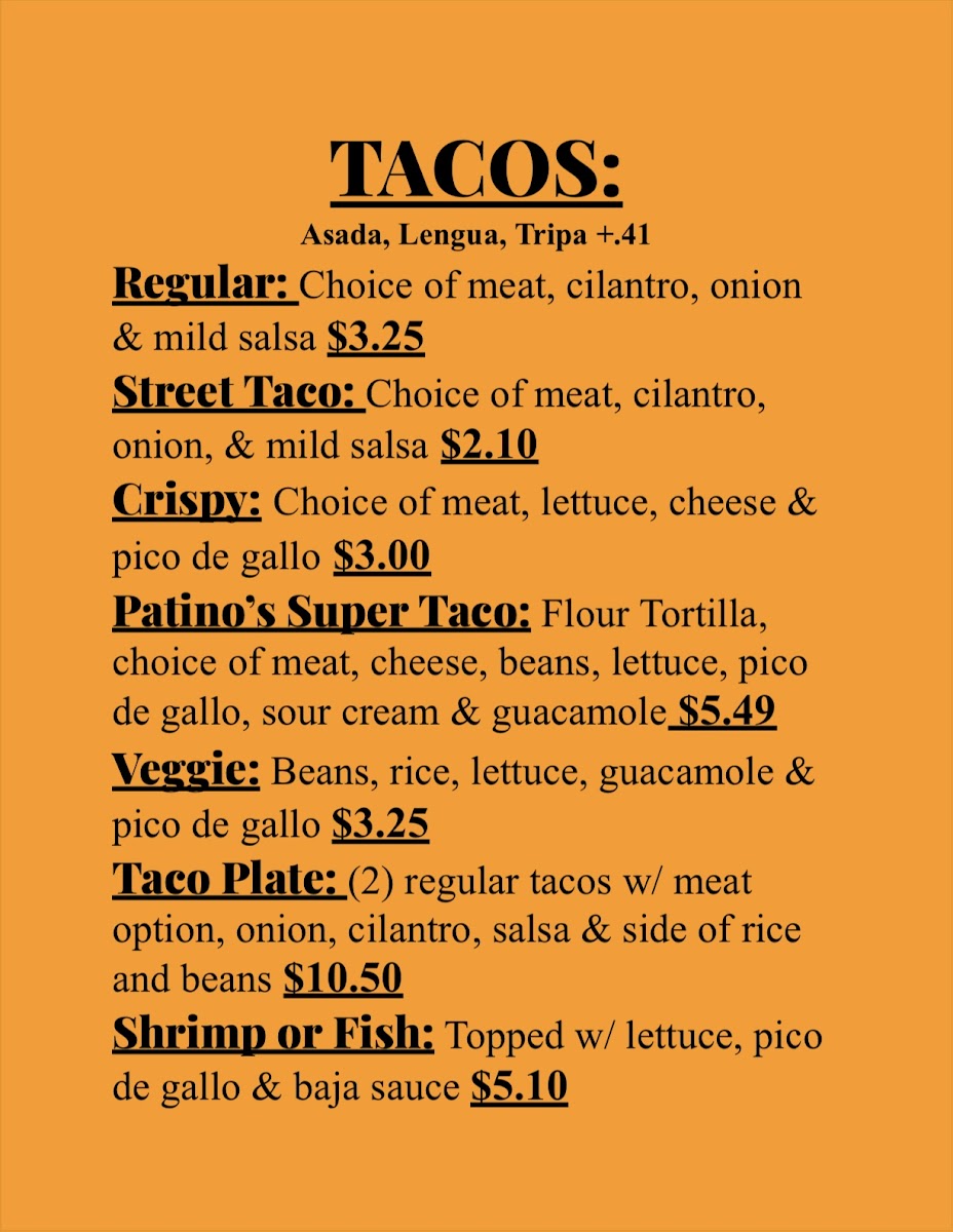 What truly sets Patino's apart are their weekly specials, where you can snag delicious tacos for just $1 on certain days, a delightful treat for any budget. Refreshing drinks like Jarritos, Horchata, and classic Mexican Coke complement your meal perfectly. Don't forget to indulge in their mouthwatering desserts, including churros and the traditional Pastel De Tres Leches, which promise to satisfy any sweet tooth.